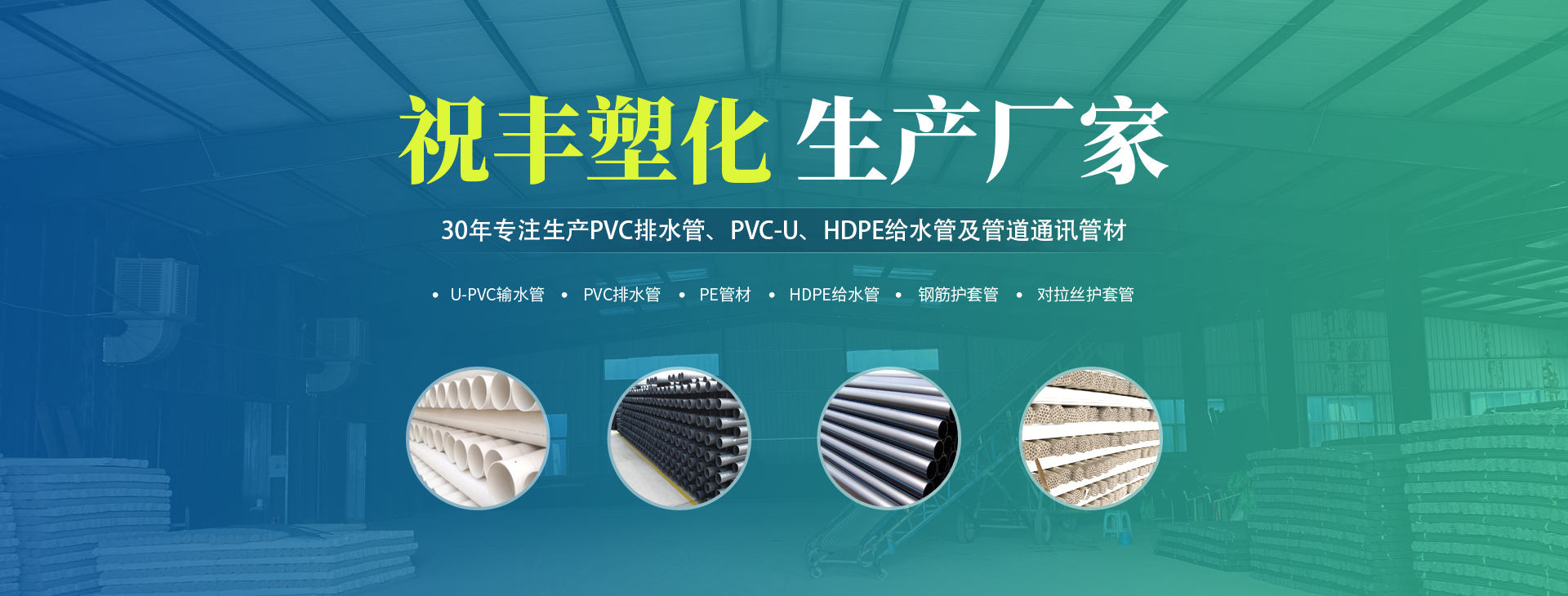 安陽市祝豐塑化有限公司坐落在滑縣工業(yè)園區(qū),東臨大廣高速,西臨京珠高速,是鄭州、鶴壁、安陽、濮陽四個(gè)城市的輸紐,交通便利、環(huán)境優(yōu)美。       公司始建于八十年代,經(jīng)過二十余年的艱辛創(chuàng)業(yè),規(guī)模不斷壯大,由十多萬元資產(chǎn)的小廠,發(fā)展到現(xiàn)占地面積達(dá)一萬多平,建筑面積一萬平,資產(chǎn)2000多萬元管材生產(chǎn)企業(yè)。公司生產(chǎn)PVC-U、PVC排水管、HDPE給水管、鋼筋護(hù)套管管道通訊管材等產(chǎn)品,廣泛用于農(nóng)田節(jié)水、高山引水、人畜用水、建筑、電力通訊等多種用途,品種齊全。為了滿足用戶需求,可承攬各種給水、節(jié)水、灌溉工程?!白XS塑化”憑借強(qiáng)勁的實(shí)力,優(yōu)良的管理水平。“以質(zhì)量求生存,以信譽(yù)求發(fā)展”的原則全力以赴和大家共同塑造美好未來。..